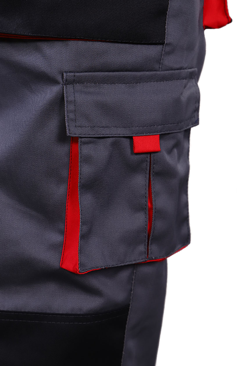 На накладных карманах обработаны малые накладные карманы. Задние половинки с накладными объемными карманами с усилением и с клапанами. На правой задней половинке накладной карман под инструменты.